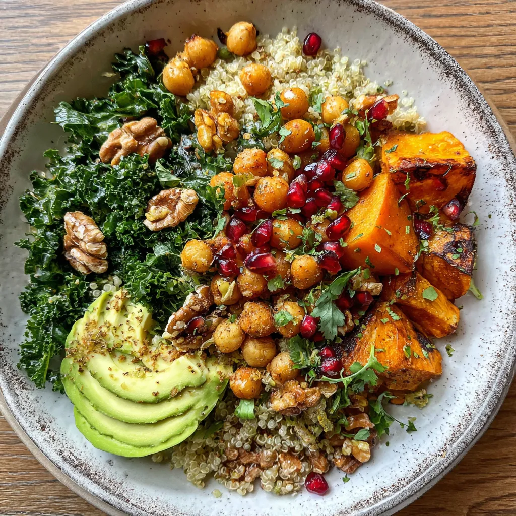 This nourishing bowl layers fluffy quinoa with turmeric-roasted sweet potatoes, silky avocado slices, and crisp kale. Topped with crunchy walnuts, jewel-like pomegranate seeds, and a tangy tahini drizzle, it sings with color and flavor.
