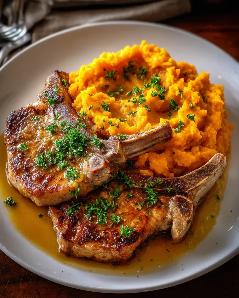 7. Slice the pork chops and serve them alongside the mashed sweet potatoes. Drizzle the pan juices over the pork and garnish with fresh parsley if desired.