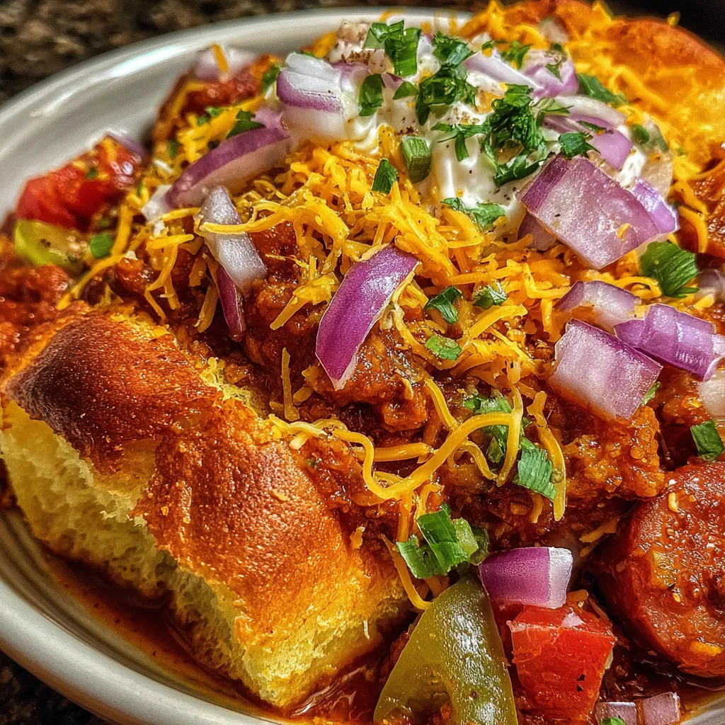 Layers of chewy buns and sliced hot dogs swim in a savory chili blend, slow-cooked until bubbly and topped with gooey cheese. Every bite offers hands-free comfort and bold flavor.