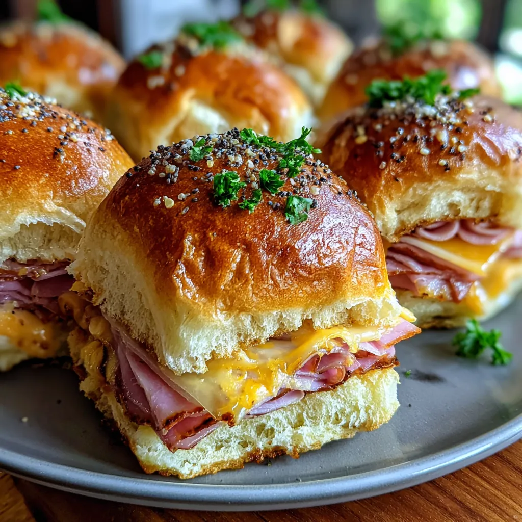Soft rolls brim with tender ham and gooey Swiss, crowned by a golden, herb-speckled butter glaze. Warm, aromatic, and irresistibly pull-apart, these sliders bring savory comfort to any gathering.