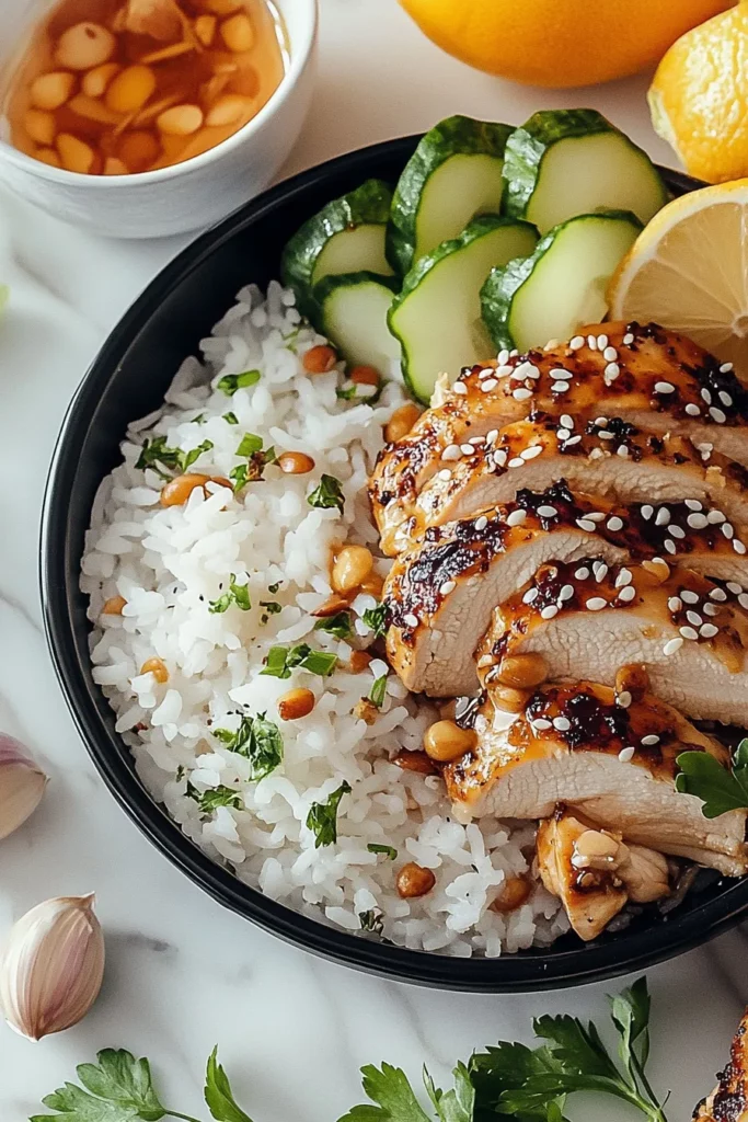 Transfer cool chicken slices and coconut rice into separate airtight containers. Store in the fridge for up to 3 days. Keeping them apart prevents the rice from absorbing too much moisture.