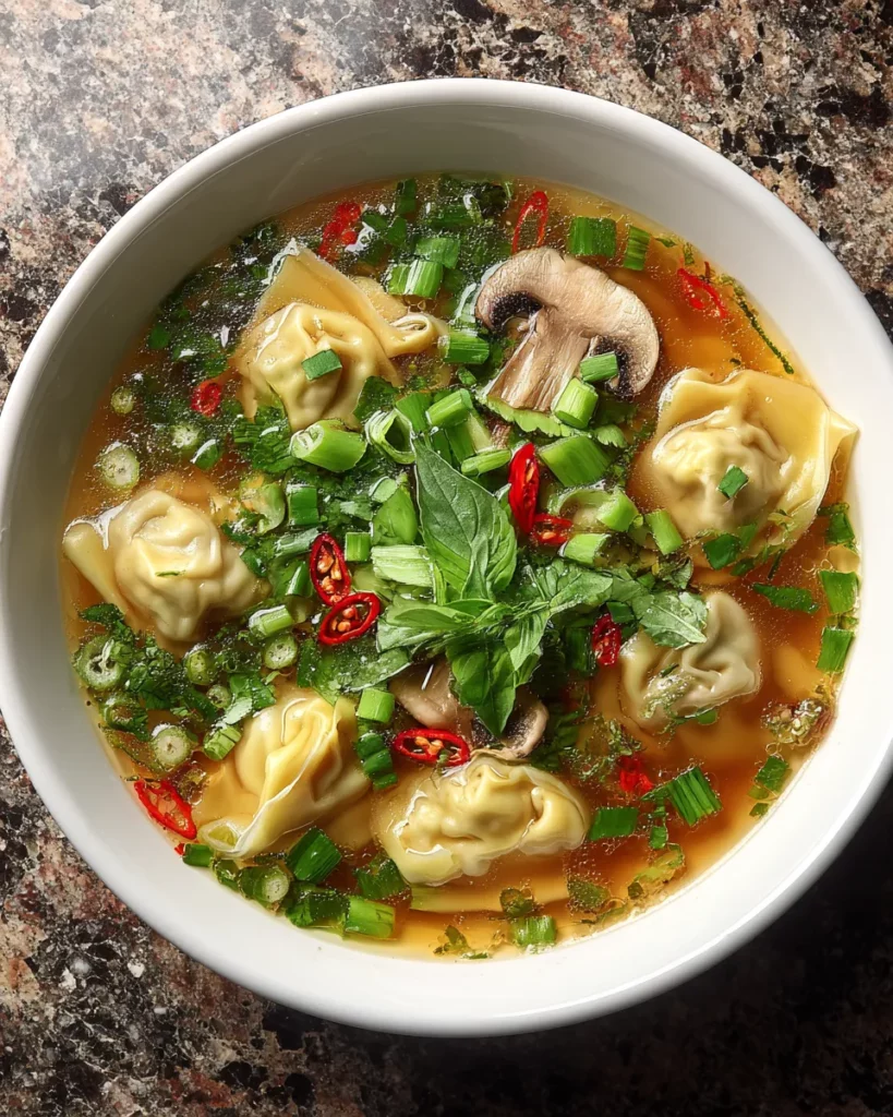 This comforting Asian wonton soup features delicate dumplings filled with seasoned meat, floating in a flavorful broth infused with fresh herbs and veggies. Perfect for any day!