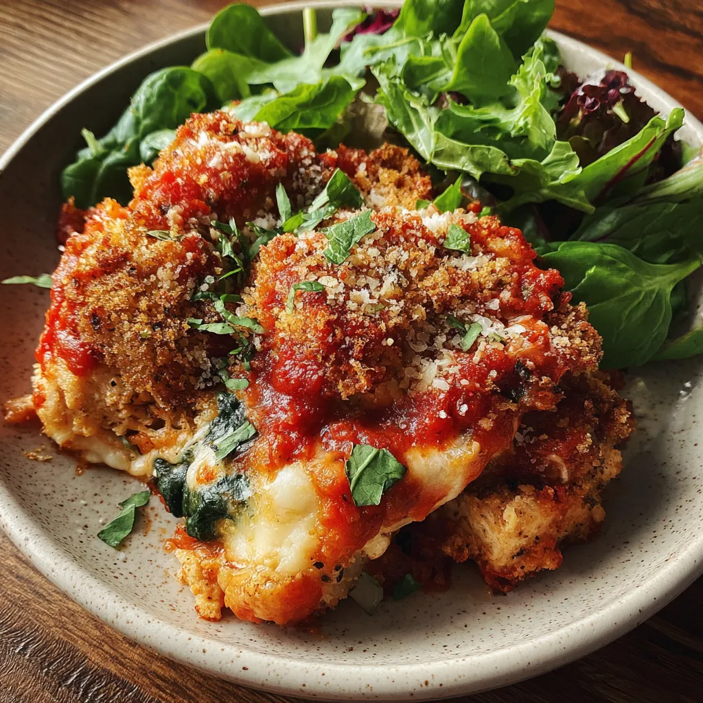Tender shredded chicken mingles with creamy cottage cheese, Greek yogurt, and spinach, all drenched in tangy marinara. Topped with mozzarella and breadcrumbs, it bakes to a golden, bubbling perfection that's rich and satisfying.