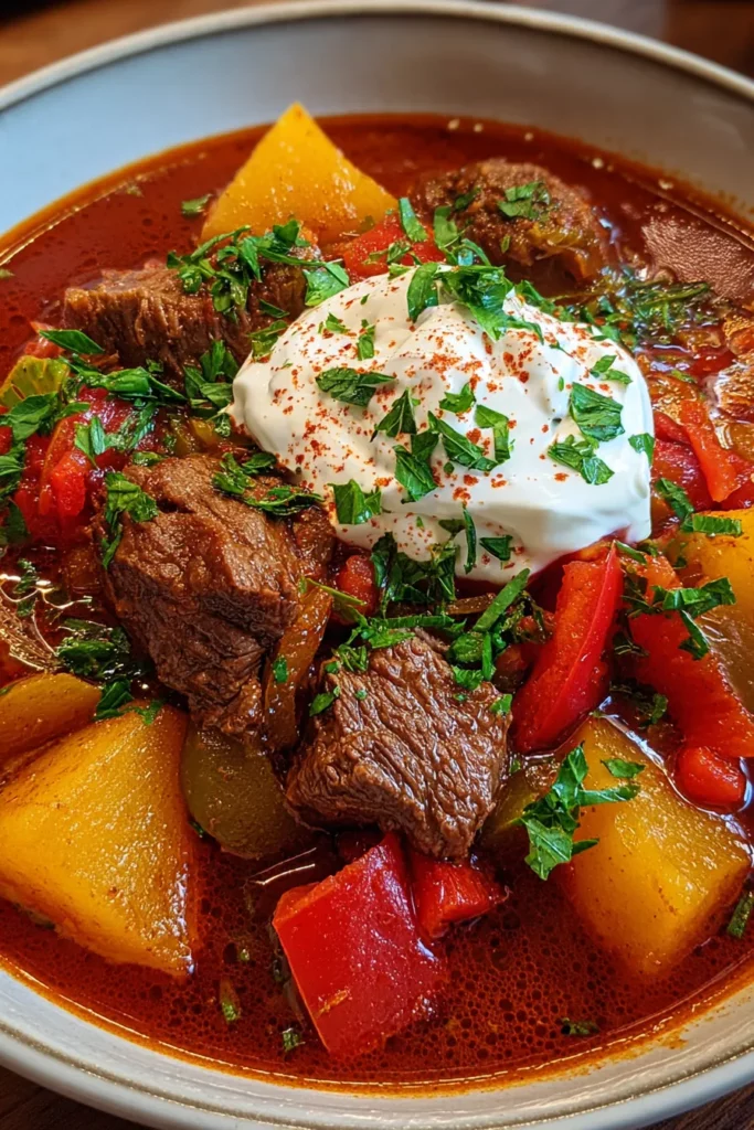 This hearty goulash is a symphony of tender beef, vibrant peppers, and aromatic spices simmered to perfection. It's the perfect dish for cozy gatherings or family dinners.