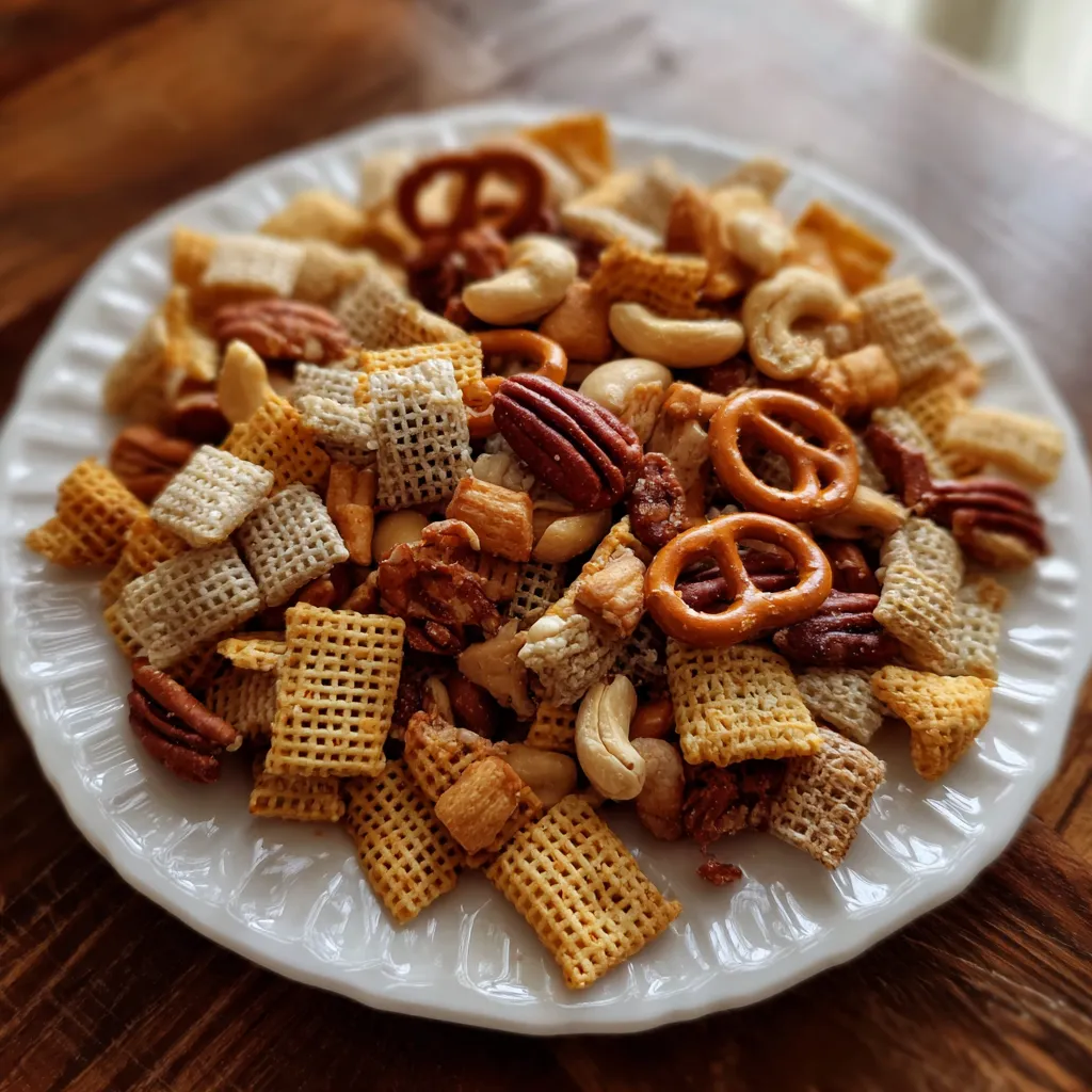 Feel the crisp crunch of Rice, Corn, and Wheat Chex mingled with salty nuts and pretzels, all drenched in a spiced butter glaze. Warm from the oven, each bite brings a burst of flavor and comfort.