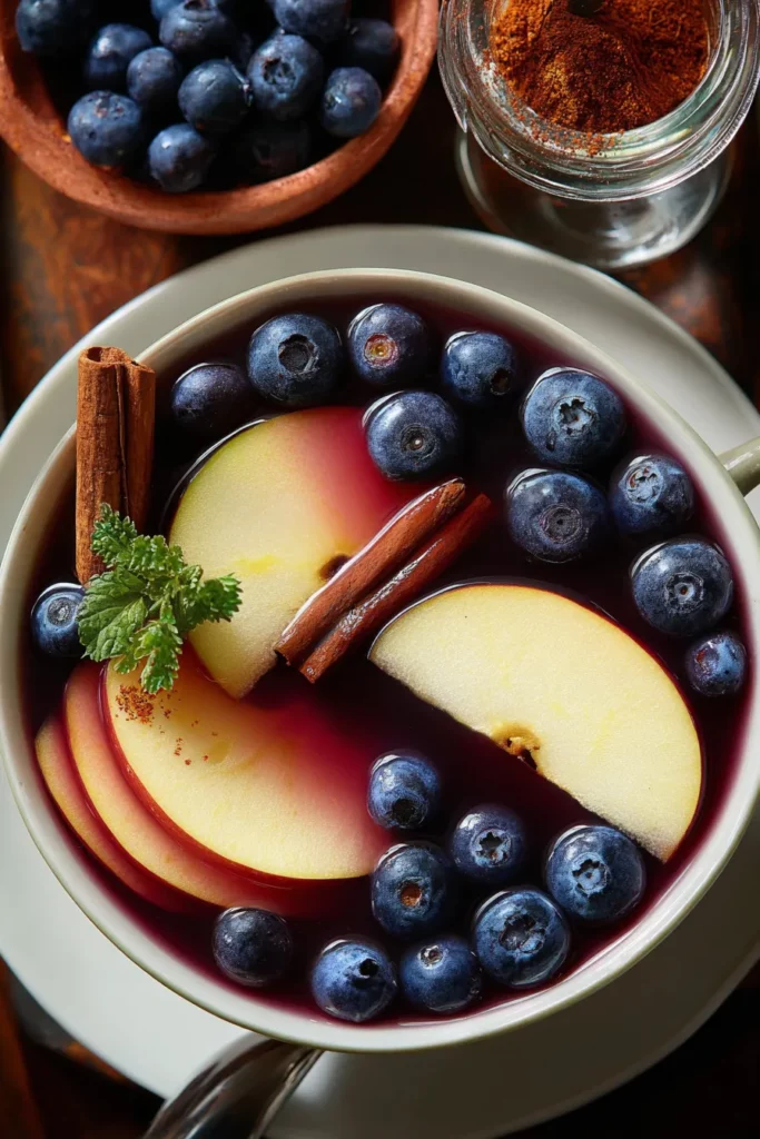 This refreshing hot cider combines sweet apple notes with blueberries, cinnamon, and spices, creating a delightful drink that warms your soul as the leaves change colors.