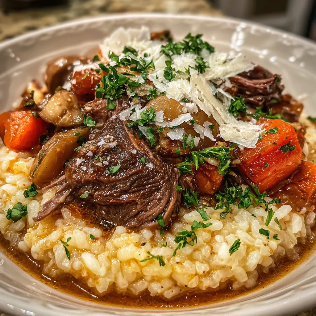 Tender chunks of slow-braised chuck roast swirl through creamy Arborio rice, infused with red wine, beef broth, and melted Parmesan. Each spoonful delivers warm, savory depths and a bright parsley finish.