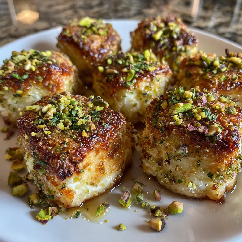 - Place warm bites on a decorative platter, then garnish with extra chopped pistachios and fresh thyme sprigs for added color and aroma.