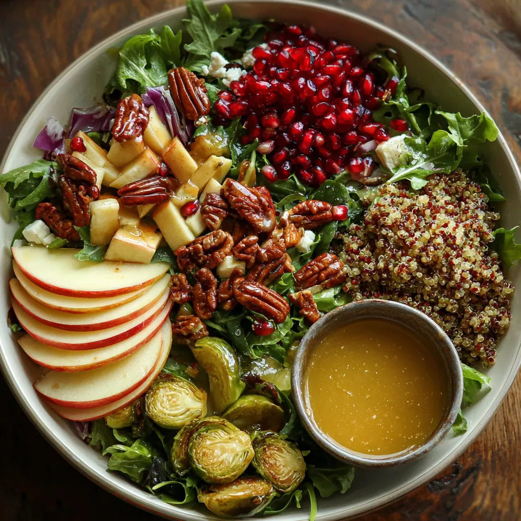 3. In a large salad bowl, combine the mixed baby greens, cooked quinoa, pomegranate seeds, roasted Brussels sprouts, diced apple, and thinly sliced red onion. Use salad tongs to gently toss until all ingredients are evenly distributed.